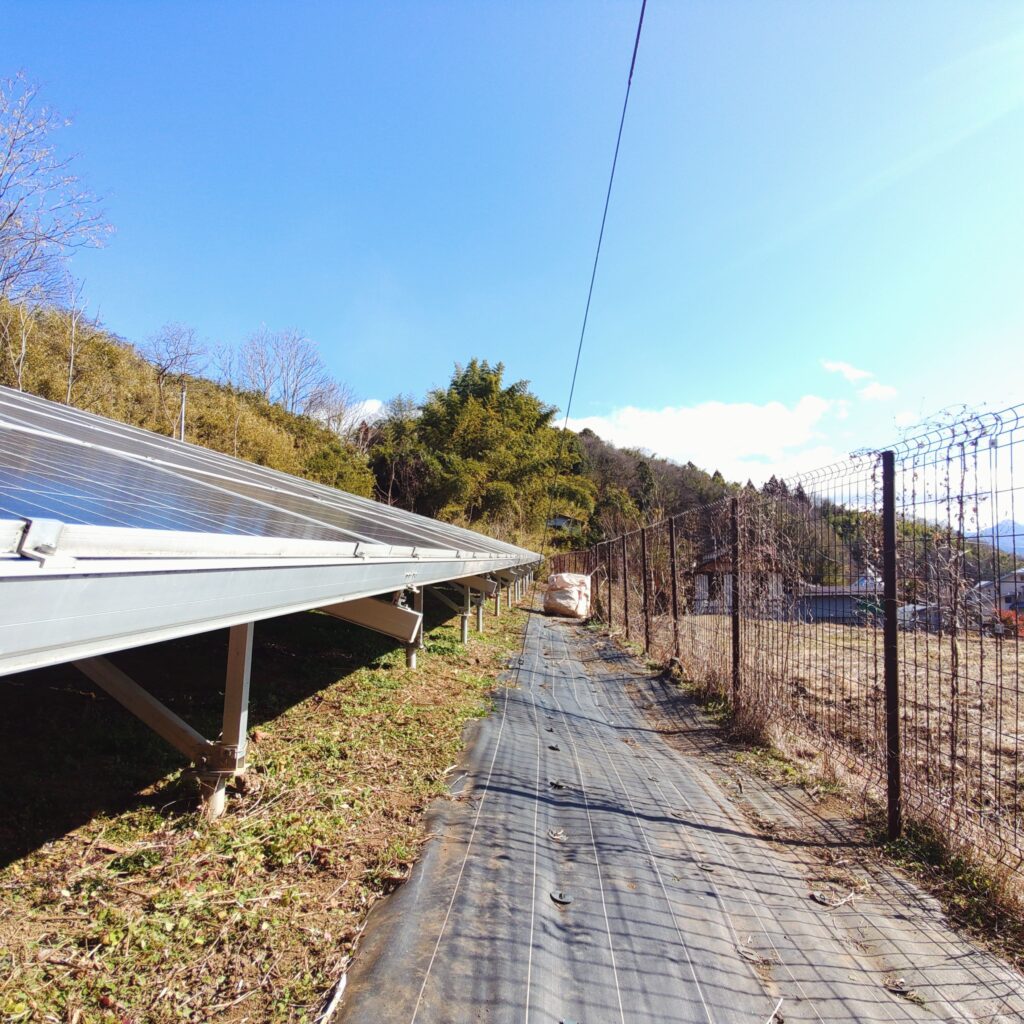 施工につきましては、敷地が真四角ではない土地で凹凸の多い傾斜地でしたが、フェンス沿いや太陽光パネルを支える支柱周りを現場加工をすることで無事施工完了しました。